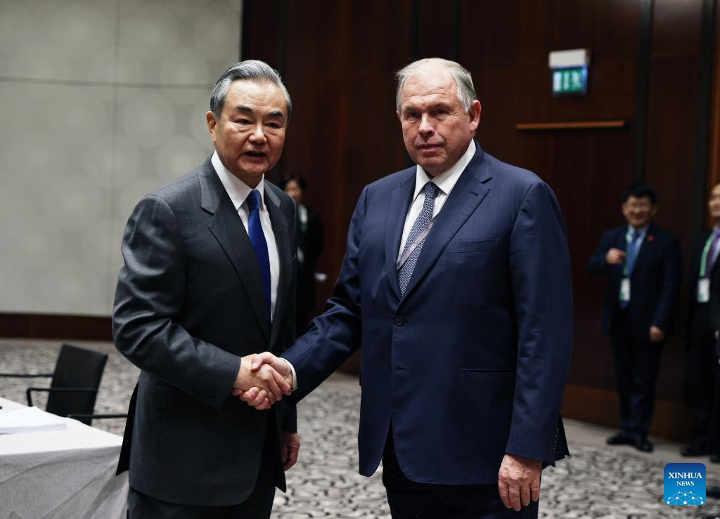 Chinese Foreign Minister Wang Yi, also a member of the Political Bureau of the Communist Party of China Central Committee, meets with his Argentine counterpart Gerardo Werthein on the sidelines of the Munich Security Conference, in Munich, Germany, Feb. 14, 2025. (Xinhua/Gao Jing)