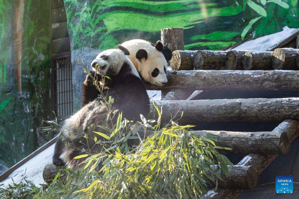 Giant panda Katyusha (R) and its mother Ding Ding enjoy meal at Moscow Zoo in Moscow, Russia, Feb. 18, 2025.