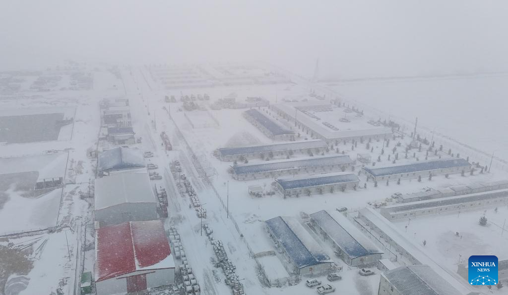 A drone photo taken on Feb. 13, 2025 shows a view of the Tuz Lake underground natural gas storage expansion project covered in snow, in Aksaray province, Türkiye. The Tuz Lake underground natural gas storage expansion project is located on the Anatolian Plateau in Aksaray Province, a central province in Türkiye, with cold and snowy winters and hot and dry summers. Chinese constructors have been working here for many years, building the natural gas storage expansion project in an effort to boost Türkiye's green and low-carbon transformation.(Xinhua/Liu Lei)