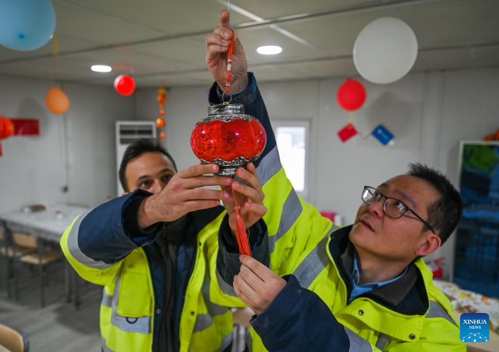 A Chinese employee (R) and a Turkish employee hang a lantern together at the site of the Tuz Lake underground natural gas storage expansion project, in Aksaray province, Türkiye, on the Lantern Festival, Feb. 12, 2025. The Tuz Lake underground natural gas storage expansion project is located on the Anatolian Plateau in Aksaray Province, a central province in Türkiye, with cold and snowy winters and hot and dry summers. Chinese constructors have been working here for many years, building the natural gas storage expansion project in an effort to boost Türkiye's green and low-carbon transformation.(Xinhua/Liu Lei)
