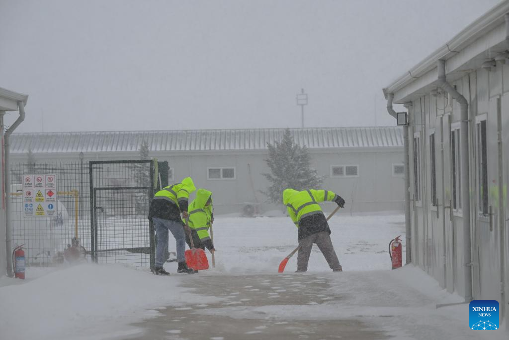 Employees clean snow in their accommodation area at the site of the Tuz Lake underground natural gas storage expansion project in Aksaray province, Türkiye, Feb. 13, 2025. The Tuz Lake underground natural gas storage expansion project is located on the Anatolian Plateau in Aksaray Province, a central province in Türkiye, with cold and snowy winters and hot and dry summers. Chinese constructors have been working here for many years, building the natural gas storage expansion project in an effort to boost Türkiye's green and low-carbon transformation.(Xinhua/Liu Lei)