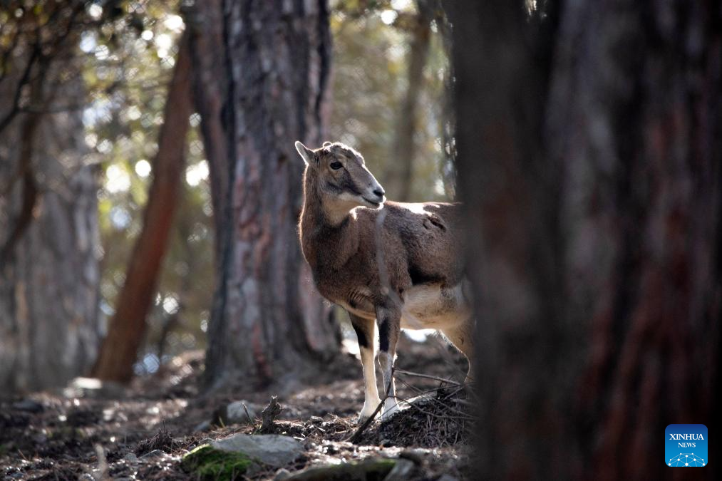 Cypriot mouflons are seen in Troodos mountains, in Cyprus on Feb. 21, 2025. The Cypriot mouflon, also known as the Cyprus wild sheep, is a rare subspecies in Cyprus. Characterized by reddish-brown fur, a dark dorsal stripe, and curved horns in males, it inhabits the forests and shrub lands of the Troodos Mountains. (Photo by George Christophorou/Xinhua)