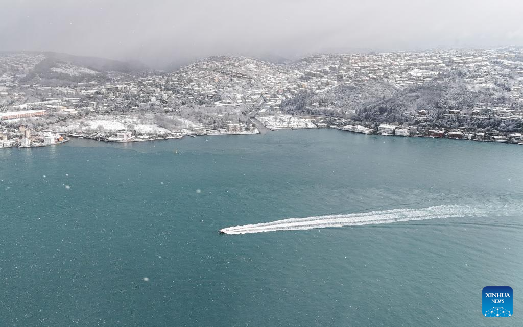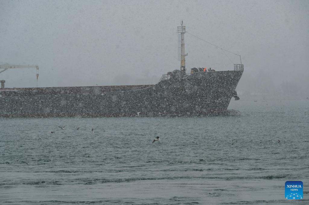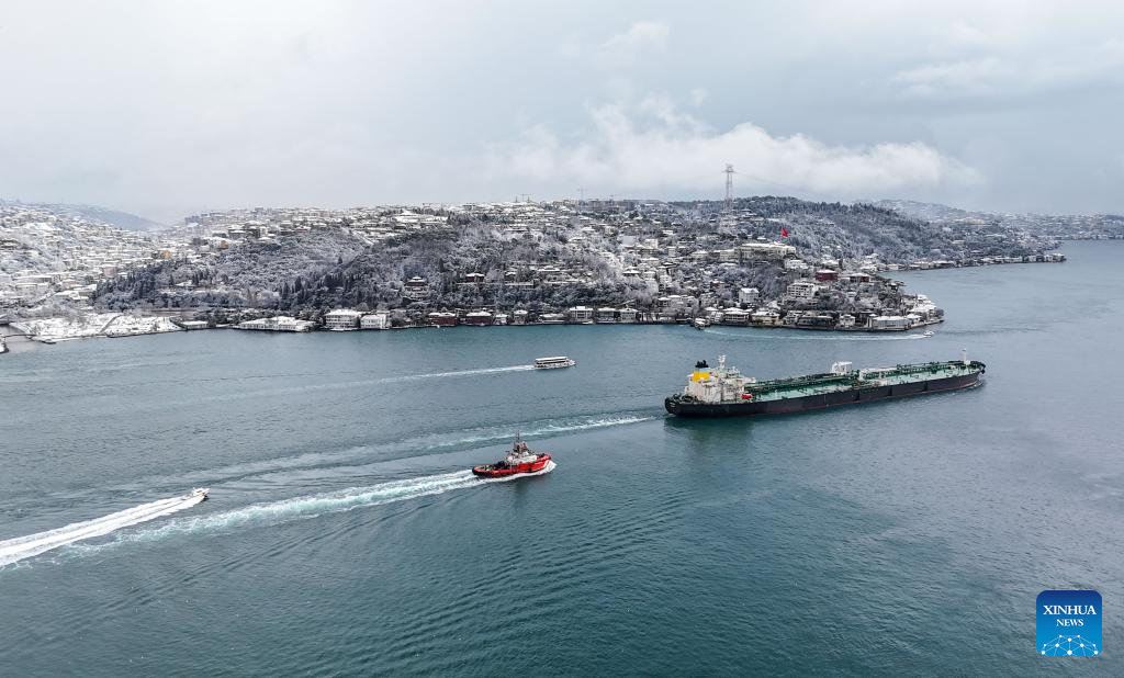 This photo taken on Feb. 21, 2025 shows a ship in the snow in the Bosporus Strait, Istanbul, Türkiye. Connecting the Black Sea with the Marmara Sea, the 30-kilometer-long Bosphorus Strait is one of the busiest waterways in the world. (Xinhua/Liu Lei)