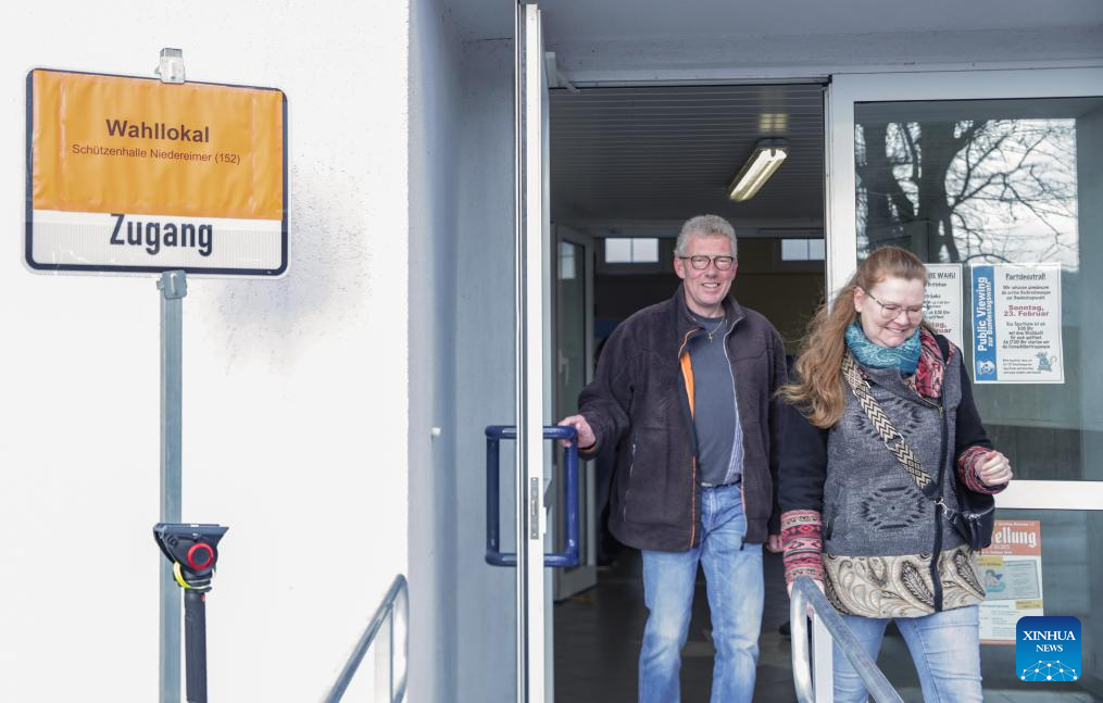 Voters walk out of a polling station in Arnsberg, Germany, Feb. 23, 2025. German voters went to polls Sunday to decide the composition of the next Bundestag, the country's lower house of parliament. (Xinhua/Zhang Fan)