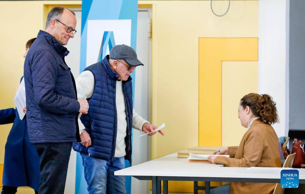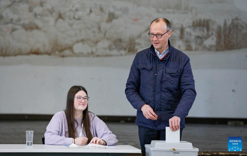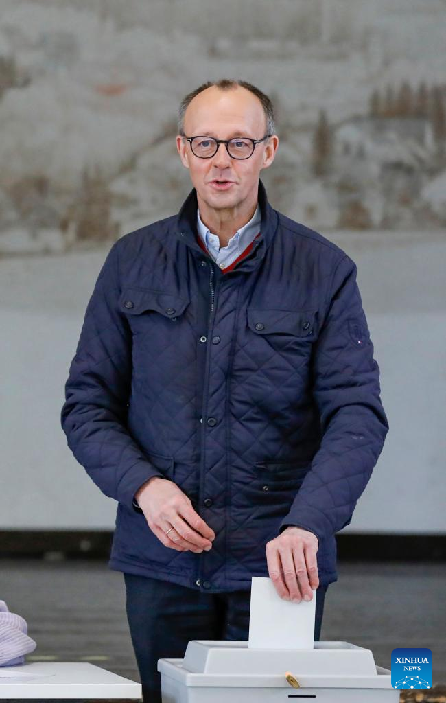 Friedrich Merz, chairman of Germany's Christian Democratic Union, votes at a polling station in Arnsberg, Germany, Feb. 23, 2025. German voters went to polls Sunday to decide the composition of the next Bundestag, the country's lower house of parliament. (Xinhua/Zhang Fan)