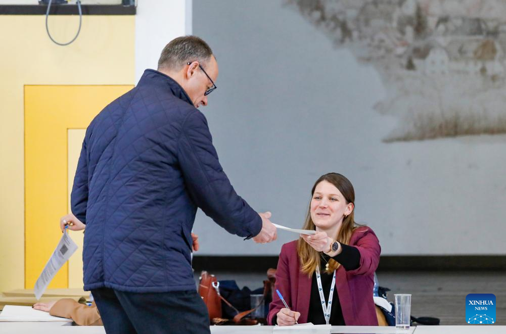 Friedrich Merz, chairman of Germany's Christian Democratic Union, takes a ballot at a polling station in Arnsberg, Germany, Feb. 23, 2025. German voters went to polls Sunday to decide the composition of the next Bundestag, the country's lower house of parliament. (Xinhua/Zhang Fan)