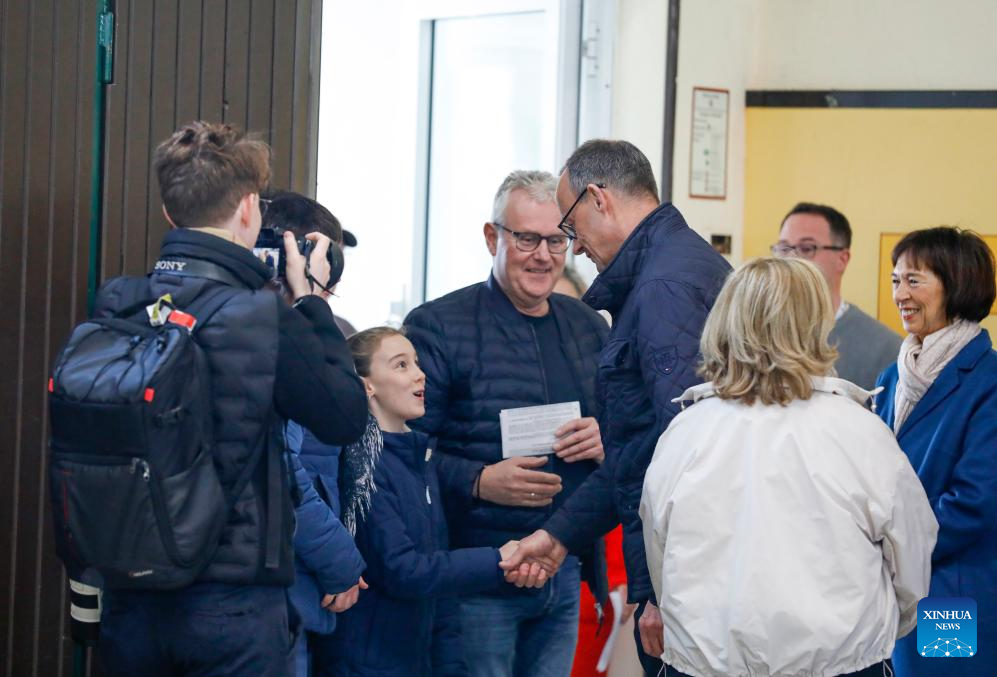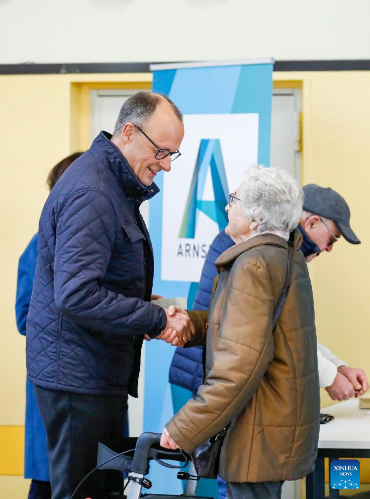 Friedrich Merz, chairman of Germany's Christian Democratic Union, shakes hands with a voter at a polling station in Arnsberg, Germany, Feb. 23, 2025. German voters went to polls Sunday to decide the composition of the next Bundestag, the country's lower house of parliament. (Xinhua/Zhang Fan)