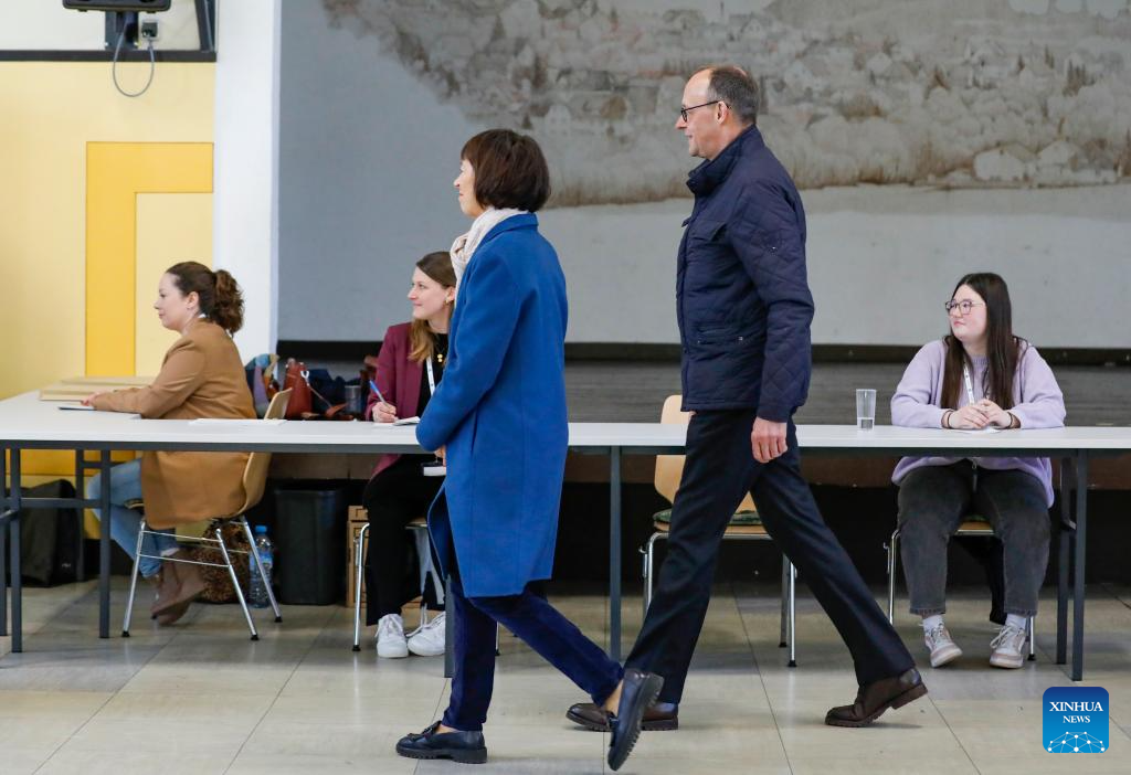 Friedrich Merz, chairman of Germany's Christian Democratic Union, leaves a polling station after voting in Arnsberg, Germany, Feb. 23, 2025. German voters went to polls Sunday to decide the composition of the next Bundestag, the country's lower house of parliament. (Xinhua/Zhang Fan)