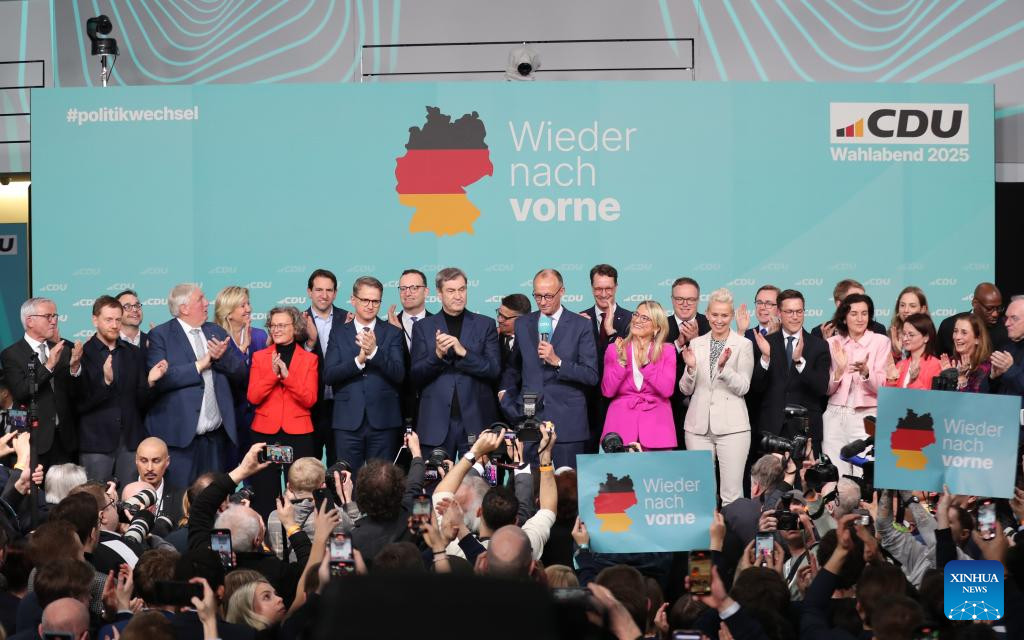 Germany's conservative bloc, the CDU and the Christian Social Union (CSU), has taken the lead in the country's 2025 federal election, preliminary results have showed. (Xinhua/Du Zheyu)