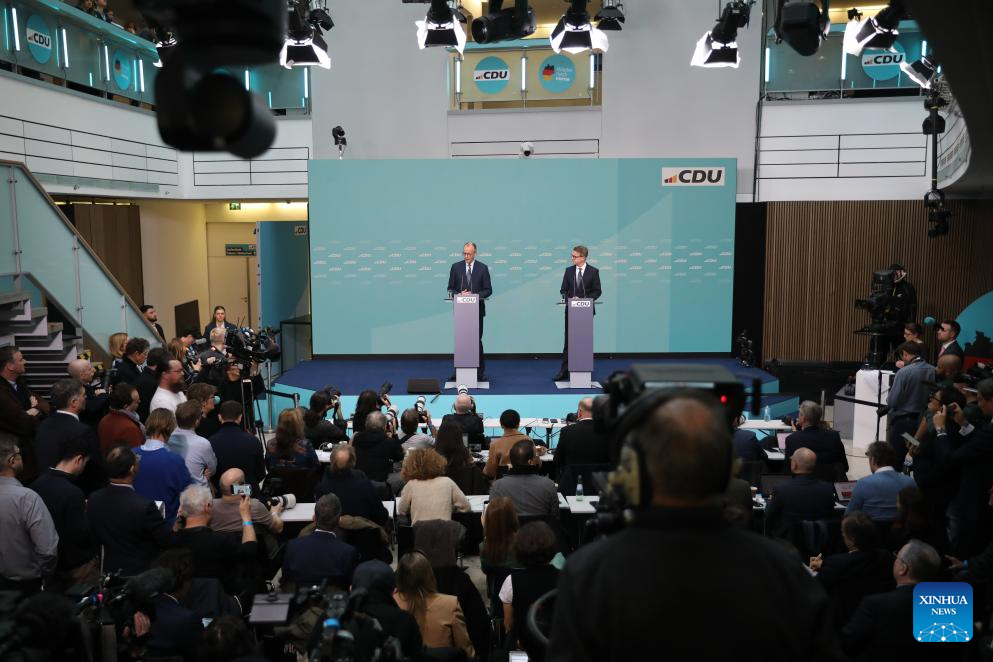 Friedrich Merz (L), chancellor candidate of the Christian Democratic Union (CDU) and the Christian Social Union (CSU), attends a press conference in Berlin, Germany, Feb. 24, 2025. Germany's conservative bloc, the CDU and the CSU, has taken the lead in the country's 2025 federal election, preliminary results have showed.