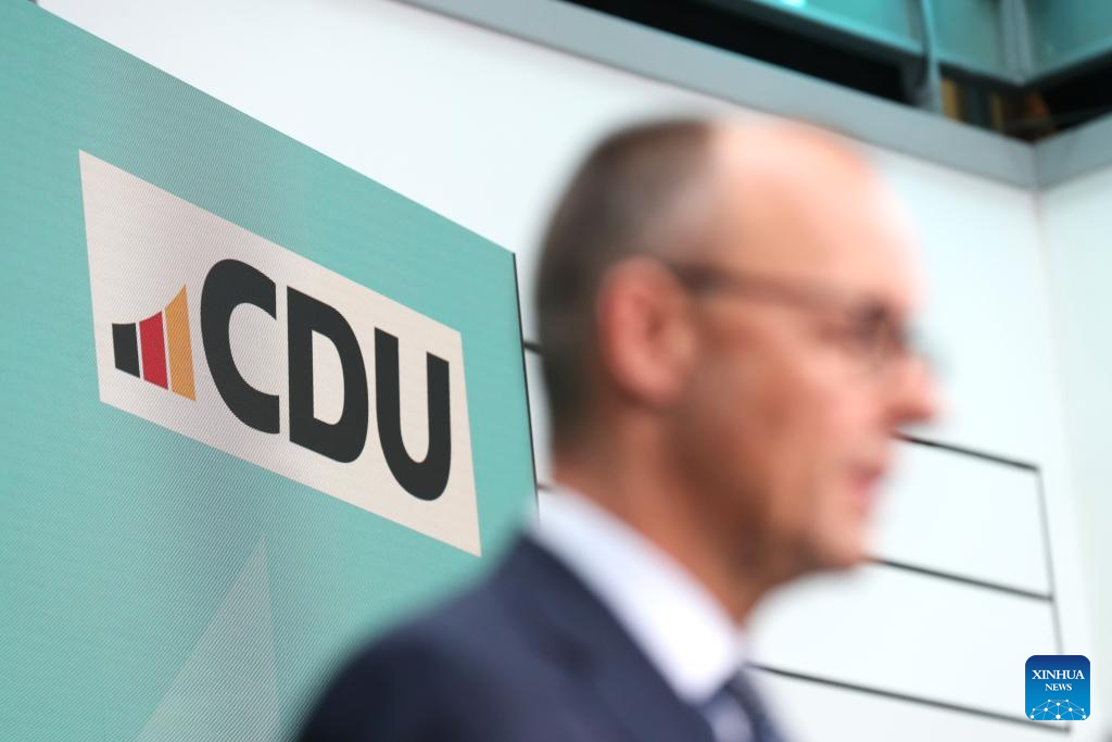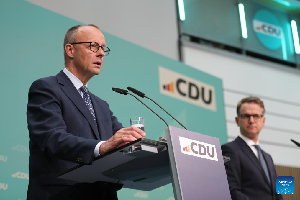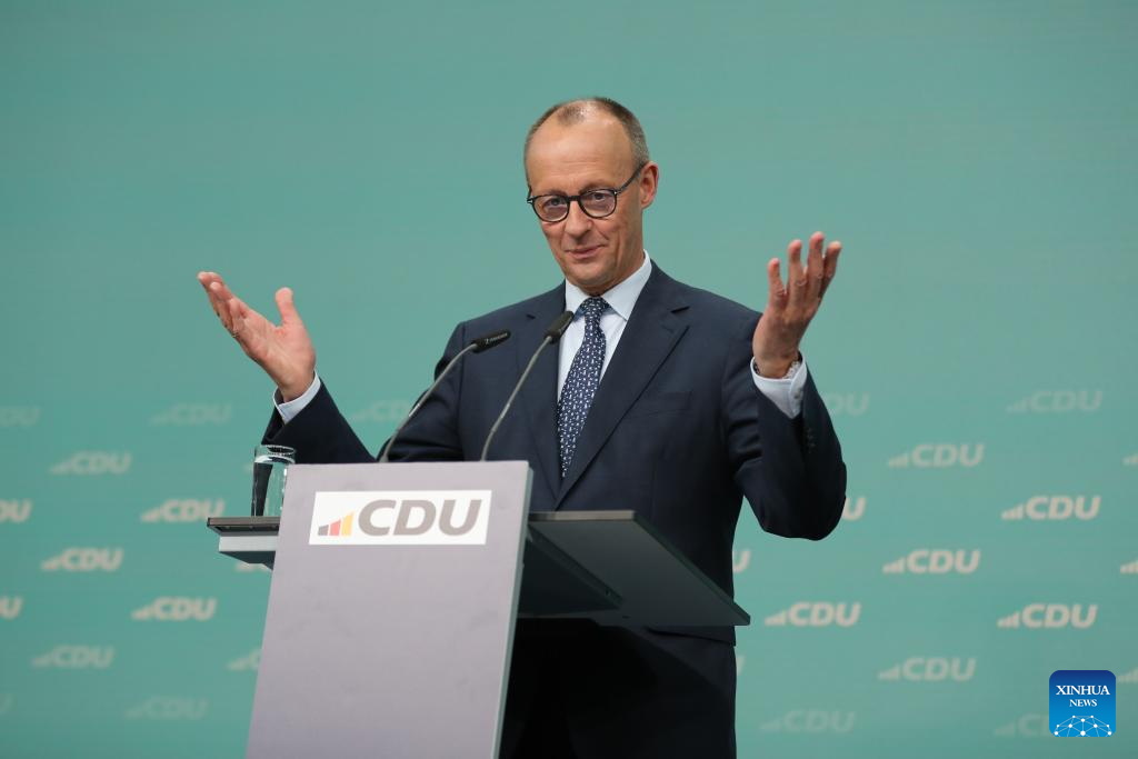 Friedrich Merz, chancellor candidate of the Christian Democratic Union (CDU) and the Christian Social Union (CSU), attends a press conference in Berlin, Germany, Feb. 24, 2025. Germany's conservative bloc, the CDU and the CSU, has taken the lead in the country's 2025 federal election, preliminary results have showed.