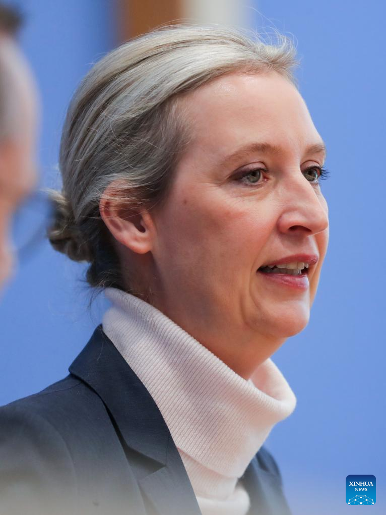 Alice Weidel, co-leader of the Alternative for Germany (AfD), attends a press conference in Berlin, Germany, Feb. 24, 2025. Germany's conservative bloc, the Christian Democratic Union (CDU) and the Christian Social Union (CSU), has taken the lead in the country's 2025 federal election, preliminary results have showed.