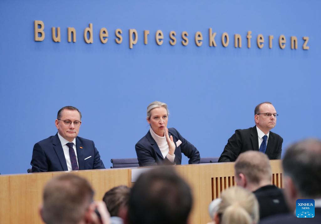Alice Weidel (C), co-leader of the Alternative for Germany (AfD), attends a press conference in Berlin, Germany, Feb. 24, 2025. Germany's conservative bloc, the Christian Democratic Union (CDU) and the Christian Social Union (CSU), has taken the lead in the country's 2025 federal election, preliminary results have showed.