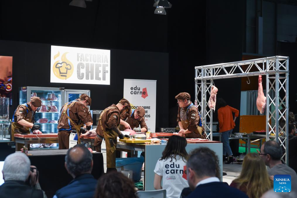 People watch a culinary contest during the Meat Attraction in Madrid, Spain, Feb. 25, 2025. The Meat Attraction, an exhibition of meat products held here from Feb. 25 to 27, has attracted nearly 300 exhibitors. (Photo by Gustavo Valiente/Xinhua)