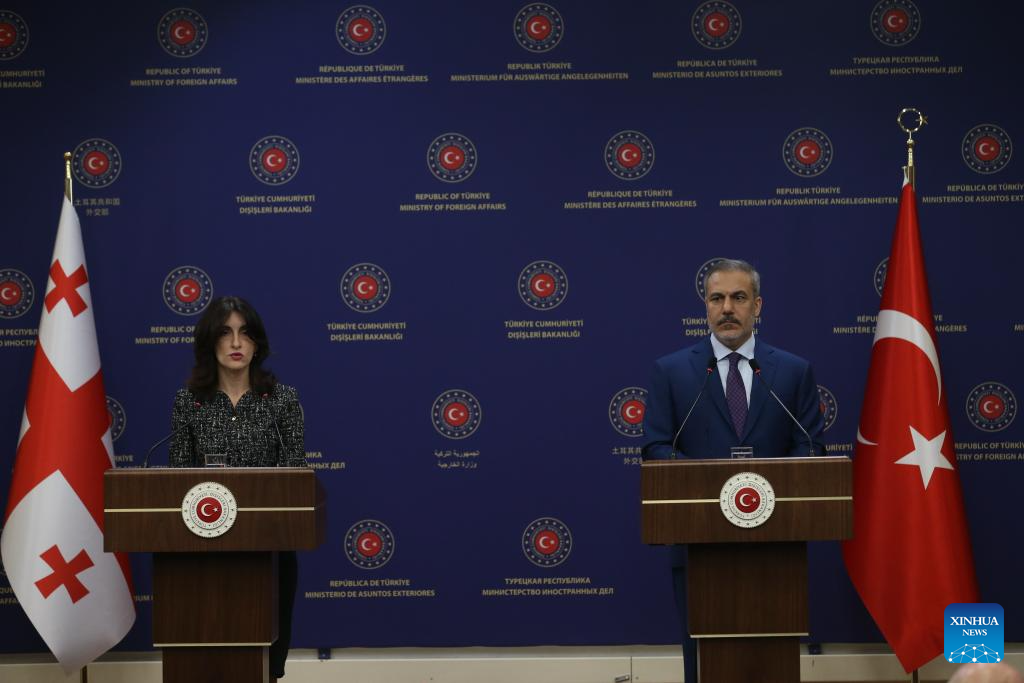 Turkish Foreign Minister Hakan Fidan (R) and Georgian Foreign Minister Maka Botchorishvili attend a joint press conference in Ankara, Türkiye, on Feb. 26, 2025. Turkish Foreign Minister Hakan Fidan on Wednesday reiterated his country's willingness to host Russia-Ukraine peace talks, saying that Türkiye "has great potential in this regard." (Mustafa Kaya/Handout via Xinhua)