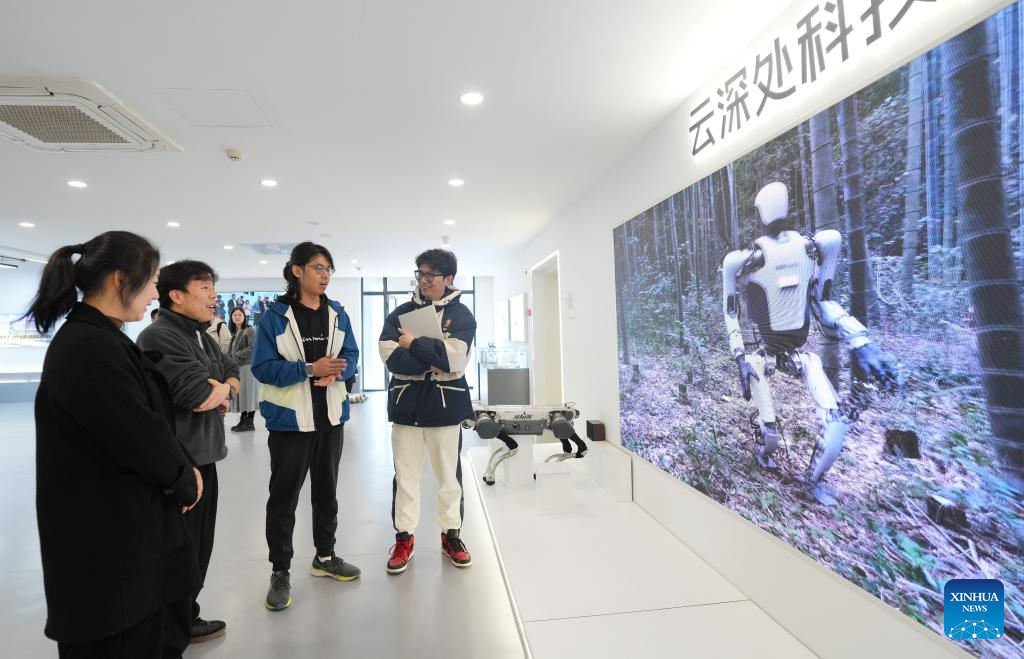 Yang Jun (2nd R) introduces an application scenario of a humanoid robot to clients at DEEP Robotics in Hangzhou, east China's Zhejiang Province, Feb. 28, 2025. Yang Jun, born in 2003, is an engineer on the technical support team at Hangzhou-based robotics firm DEEP Robotics. An enthusiast of anime and mech models, he majored in computer science and technology in college and logged in his dreamed walk of life after graduation.