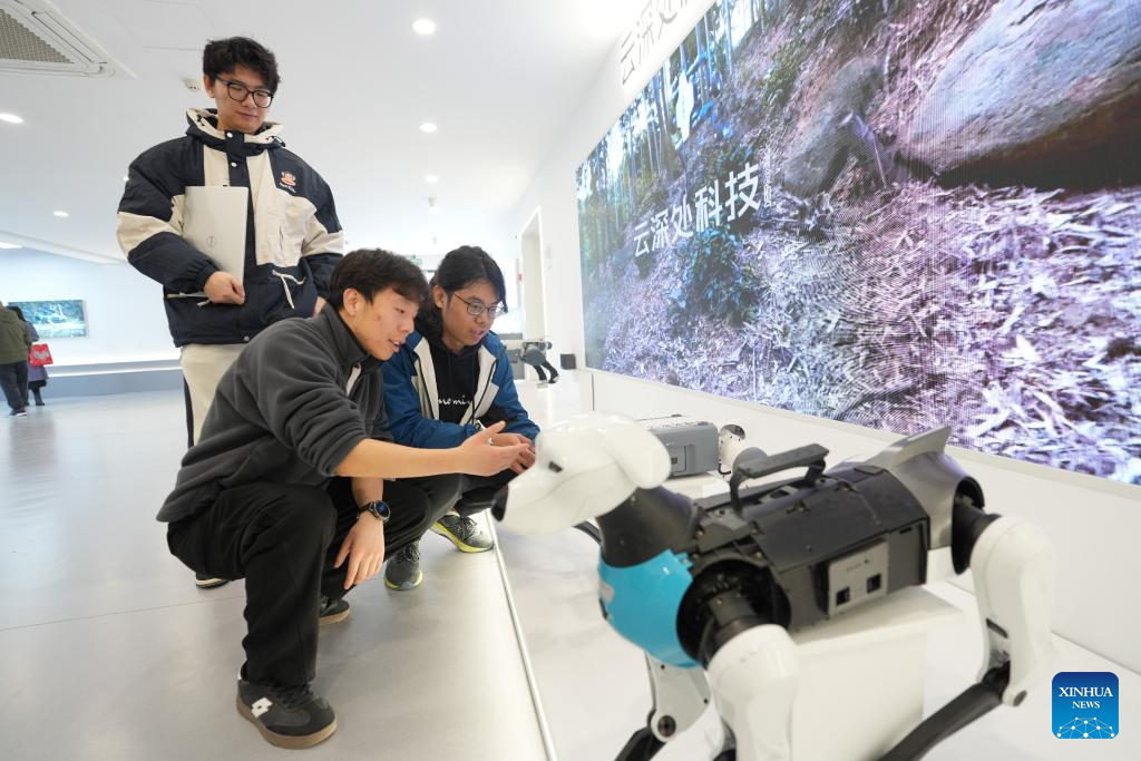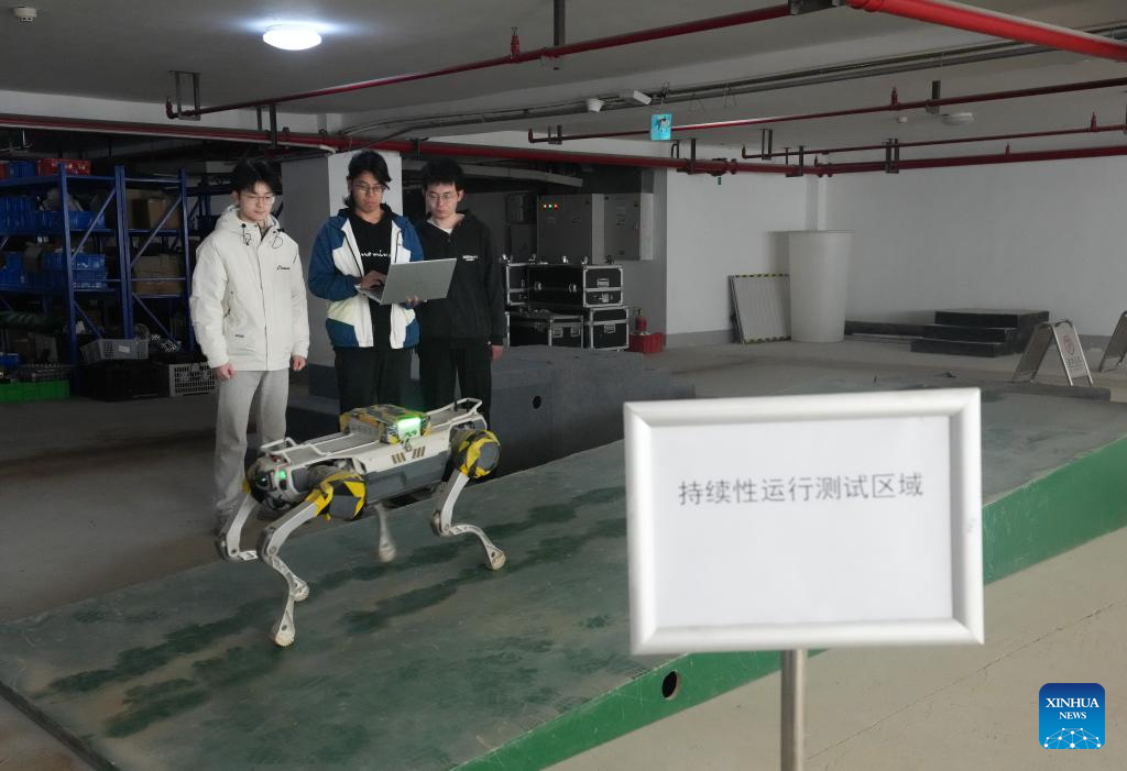 Yang Jun (C) and his colleagues debug a robotic dog at DEEP Robotics in Hangzhou, east China's Zhejiang Province, Feb. 28, 2025. Yang Jun, born in 2003, is an engineer on the technical support team at Hangzhou-based robotics firm DEEP Robotics. An enthusiast of anime and mech models, he majored in computer science and technology in college and logged in his dreamed walk of life after graduation.