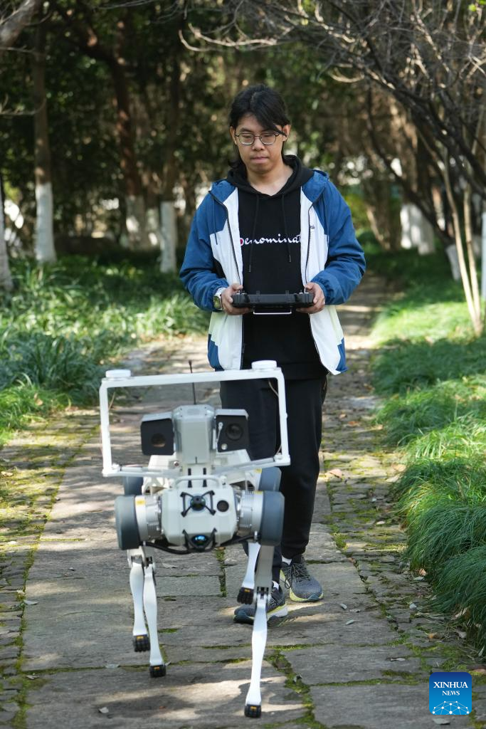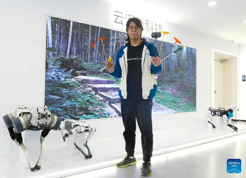 Yang Jun tests a quadruped robot in Hangzhou, east China's Zhejiang Province, Feb. 28, 2025. Yang Jun, born in 2003, is an engineer on the technical support team at Hangzhou-based robotics firm DEEP Robotics. An enthusiast of anime and mech models, he majored in computer science and technology in college and logged in his dreamed walk of life after graduation.