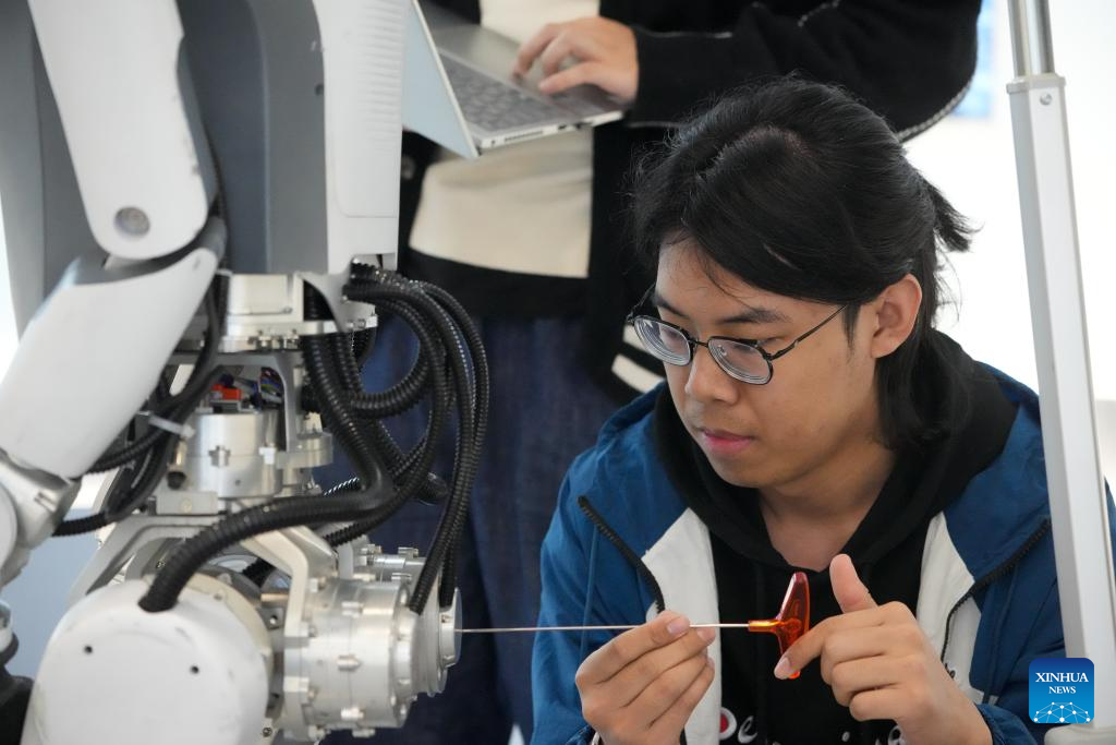 Yang Jun (R) and his colleague debug a humanoid robot in Hangzhou, east China's Zhejiang Province, Feb. 28, 2025. Yang Jun, born in 2003, is an engineer on the technical support team at Hangzhou-based robotics firm DEEP Robotics. An enthusiast of anime and mech models, he majored in computer science and technology in college and logged in his dreamed walk of life after graduation.