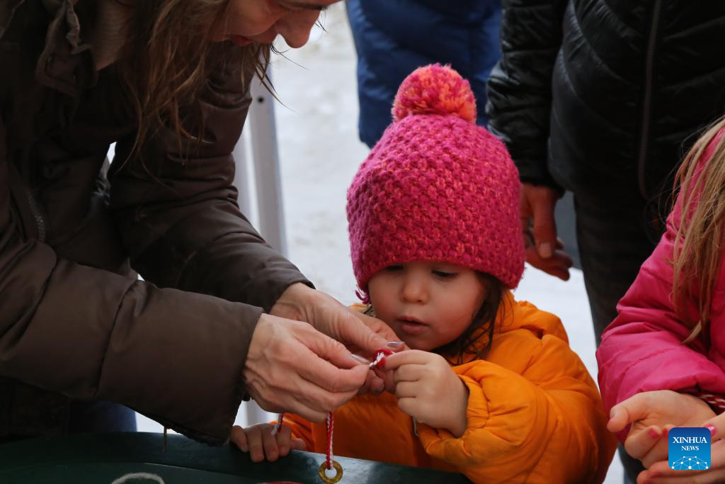 A kid learns to make Martenitsa in Sofia, Bulgaria, March 1, 2025. Bulgarians marked the day named Baba Marta on Saturday. On Barba Marta and a few days afterwards, people will follow the tradition of wearing "Martenitsa," a small piece of adornment made of white and red yarn or silk threads. (Xinhua/Lin Hao)