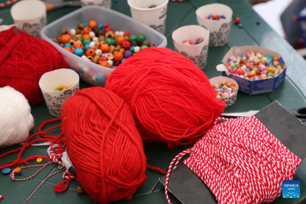 The materials for making Martenitsi are placed on the table in Sofia, Bulgaria, March 1, 2025. Bulgarians marked the day named Baba Marta on Saturday. On Barba Marta and a few days afterwards, people will follow the tradition of wearing "Martenitsa," a small piece of adornment made of white and red yarn or silk threads. (Xinhua/Lin Hao)
