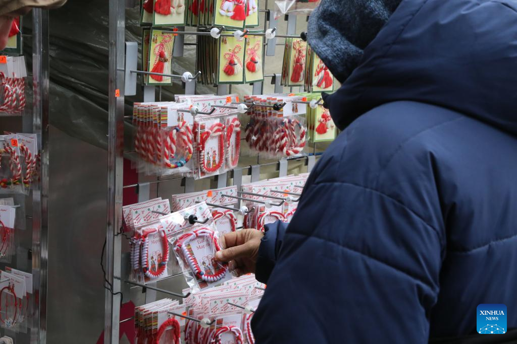 A customer selects Martenitsa at a store in Sofia, Bulgaria, March 1, 2025. Bulgarians marked the day named Baba Marta on Saturday. On Barba Marta and a few days afterwards, people will follow the tradition of wearing "Martenitsa," a small piece of adornment made of white and red yarn or silk threads. (Xinhua/Lin Hao)