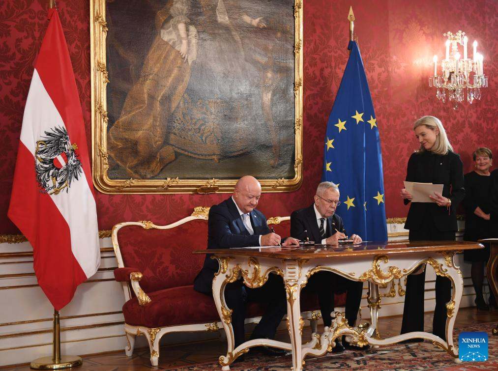 Austrian President Alexander Van der Bellen (C) and Leader of the People's Party Christian Stocker (L) attend the swearing-in ceremony in Vienna, Austria, March 3, 2025. Austria's new government was sworn in on Monday, ending five months of political deadlock over forming a coalition. (Xinhua/He Canling)