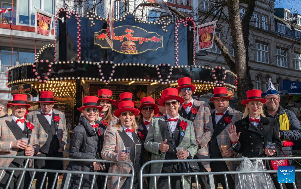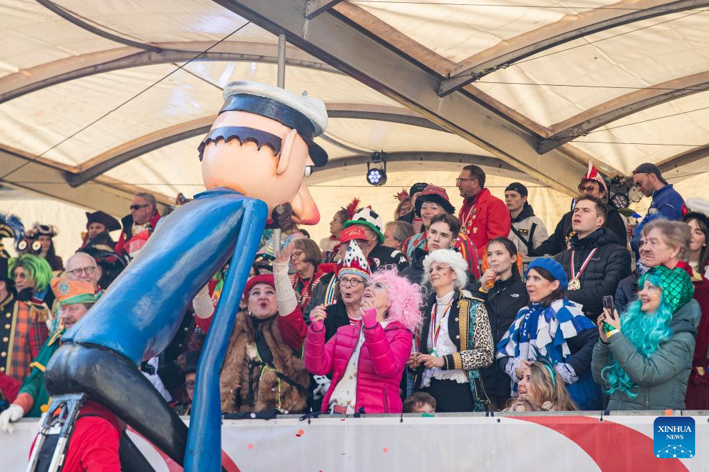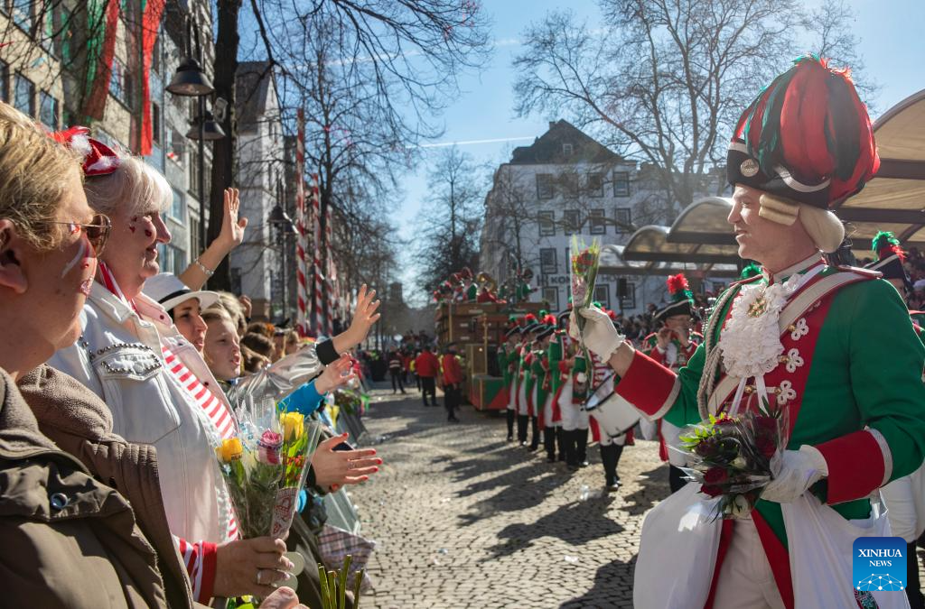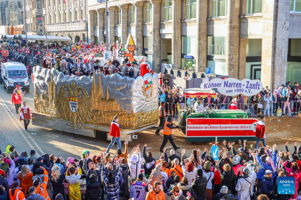 Revelers take part in the Rose Monday carnival parade in Cologne, Germany, March 3, 2025. Rose Monday is the biggest one of its kind held during the annual carnival season in this city of historical heritages. (Xinhua/Zhang Fan)
