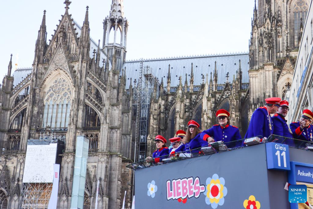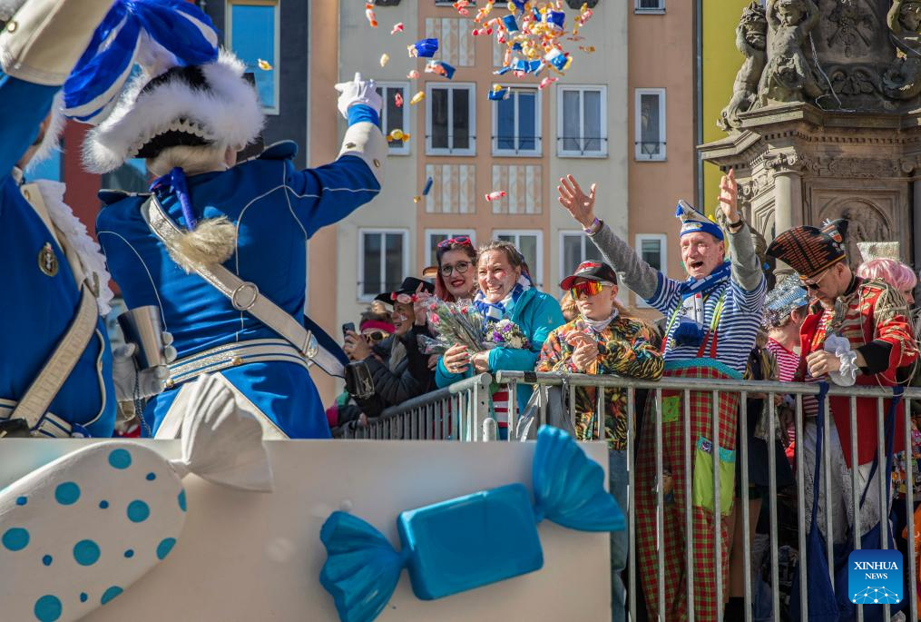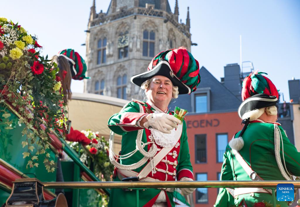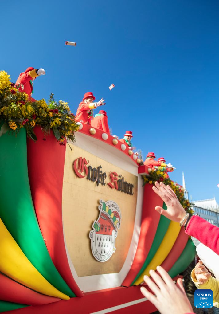 Revelers cast candies and chocolates to the crowd during the Rose Monday carnival parade in Cologne, Germany, March 3, 2025. Rose Monday is the biggest one of its kind held during the annual carnival season in this city of historical heritages. (Xinhua/Zhang Fan)