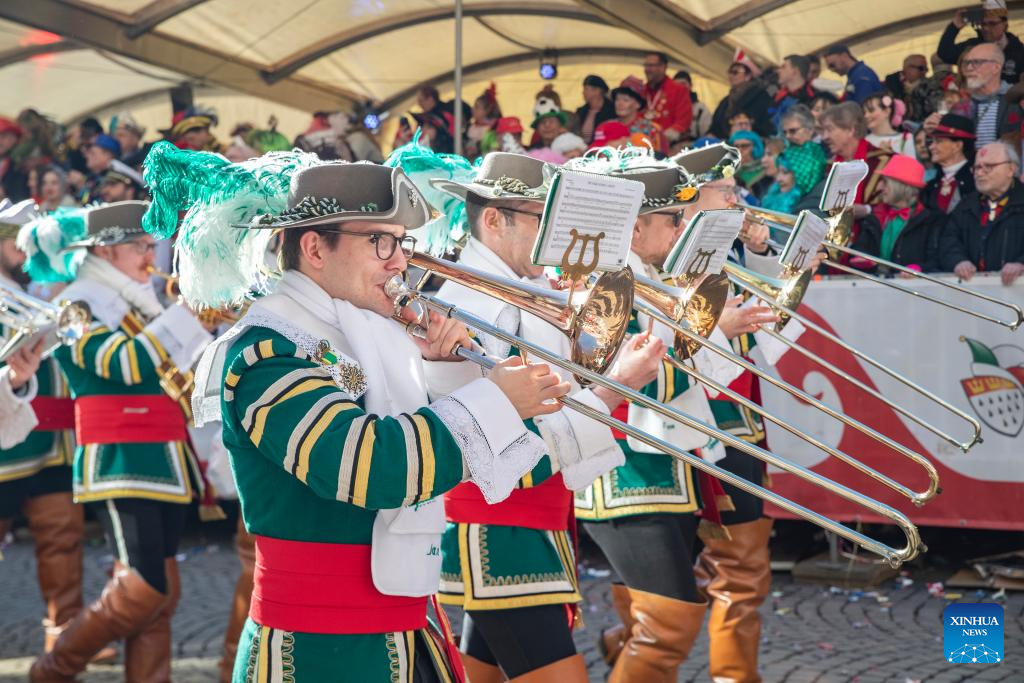 Bands take part in the Rose Monday carnival parade in Cologne, Germany, March 3, 2025. Rose Monday is the biggest one of its kind held during the annual carnival season in this city of historical heritages. (Xinhua/Zhang Fan)