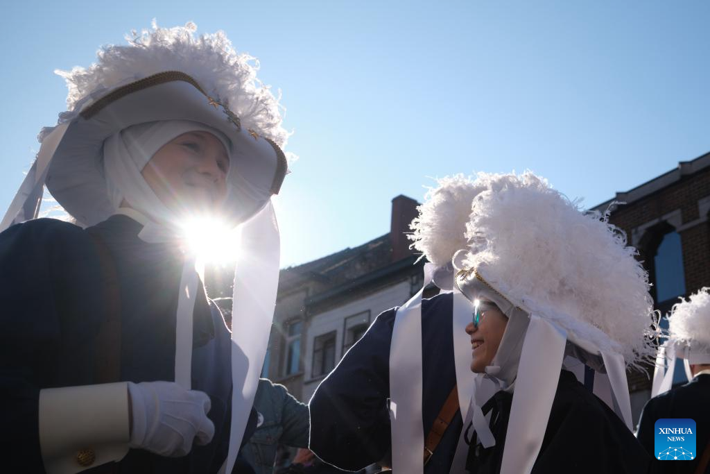 People in costumes of "Gille" attend the Binche Carnival, a UNESCO World Heritage event, in Binche, Belgium, March 4, 2025. (Xinhua/Meng Dingbo)