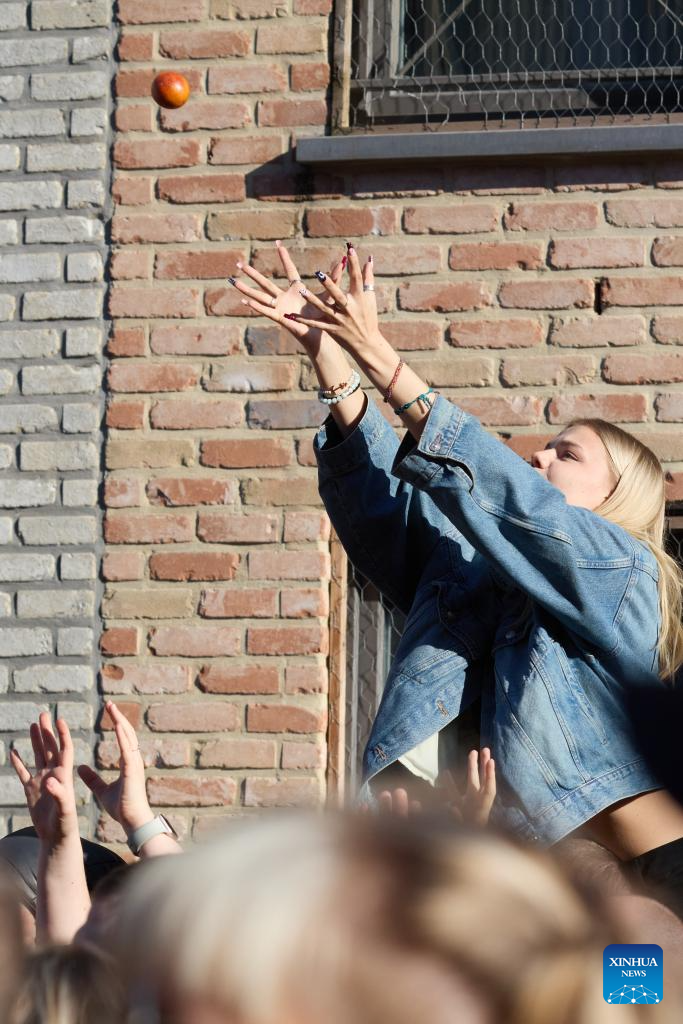 A woman catches an orange during the Binche Carnival, a UNESCO World Heritage event, in Binche, Belgium, March 4, 2025. (Xinhua/Meng Dingbo)