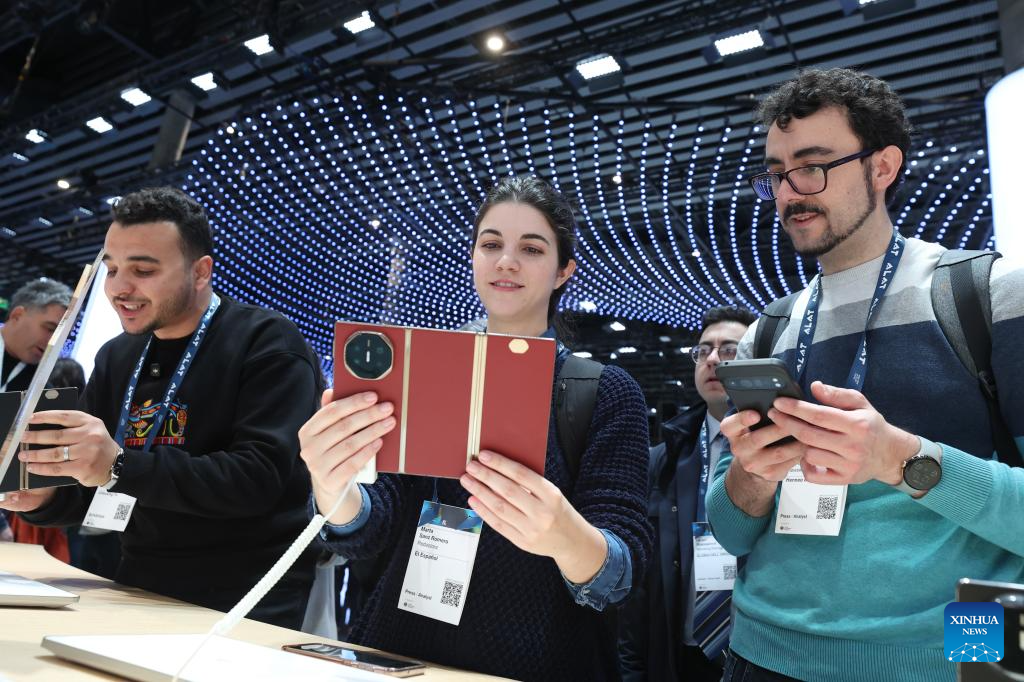 People look at a Huawei's tri-fold smartphone at the 2025 Mobile World Congress in Barcelona, Spain, March 3, 2025. The 2025 Mobile World Congress (MWC) opened here on Monday, bringing together industry leaders, policymakers, and technology innovators to explore advancements in 5G, artificial intelligence (AI), and advanced connectivity.