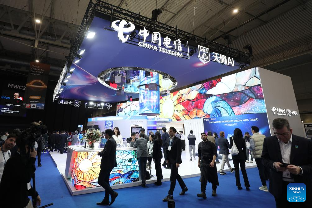 People visit the booth of China Telecom at the 2025 Mobile World Congress in Barcelona, Spain, March 3, 2025. The 2025 Mobile World Congress (MWC) opened here on Monday, bringing together industry leaders, policymakers, and technology innovators to explore advancements in 5G, artificial intelligence (AI), and advanced connectivity.