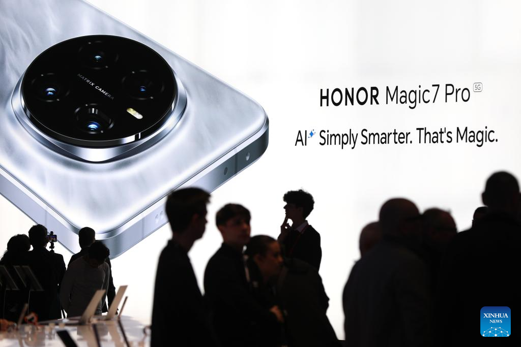 People visit the booth of Honor at the 2025 Mobile World Congress in Barcelona, Spain, March 3, 2025. The 2025 Mobile World Congress (MWC) opened here on Monday, bringing together industry leaders, policymakers, and technology innovators to explore advancements in 5G, artificial intelligence (AI), and advanced connectivity.