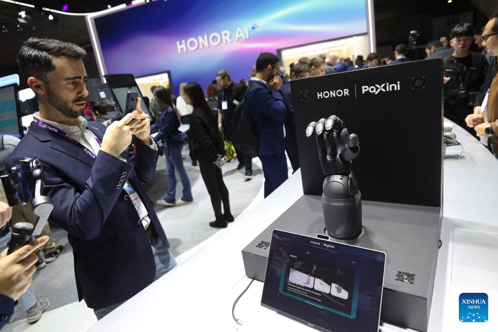 A man takes photos of a robot hand at the booth of Honor at the 2025 Mobile World Congress in Barcelona, Spain, March 3, 2025. The 2025 Mobile World Congress (MWC) opened here on Monday, bringing together industry leaders, policymakers, and technology innovators to explore advancements in 5G, artificial intelligence (AI), and advanced connectivity.