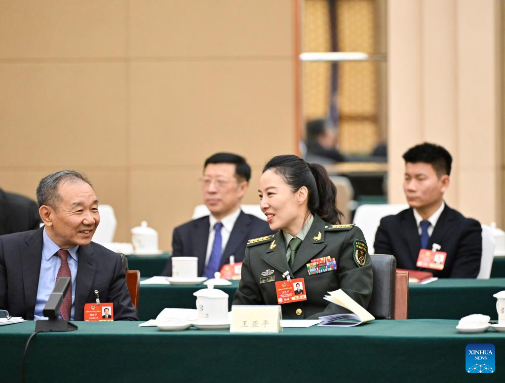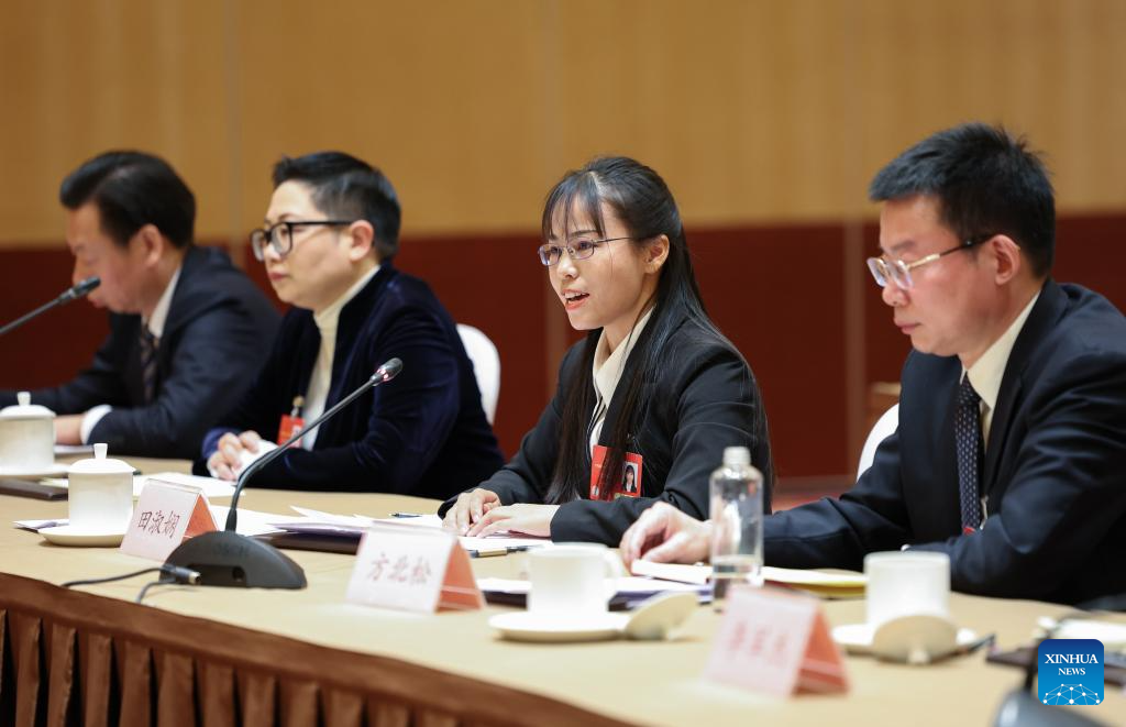 Tian Shuxian (2nd R), a deputy to the 14th National People's Congress (NPC), speaks during a group meeting of the delegation of Hubei Province at the third session of the 14th NPC in Beijing, capital of China, March 6, 2025.