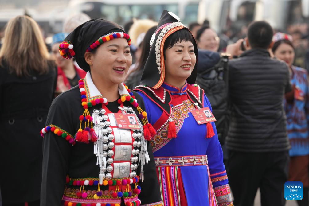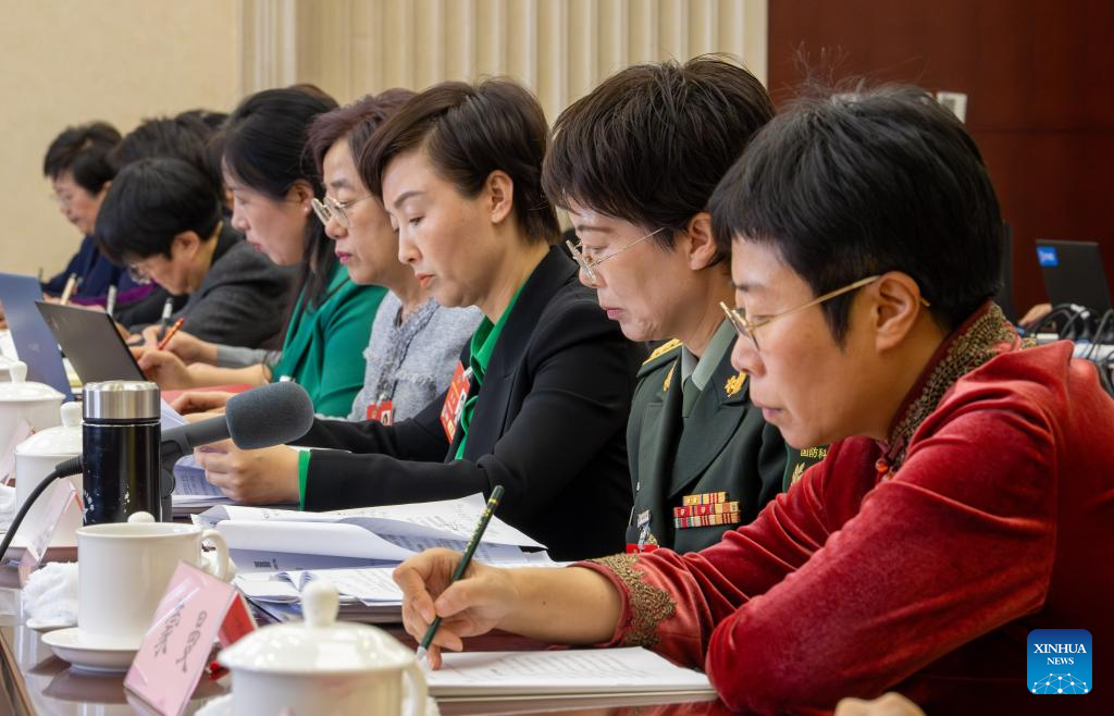 National political advisors from the All-China Women's Federation attend a discussion at the third session of the 14th National Committee of the Chinese People's Political Consultative Conference (CPPCC) in Beijing, capital of China, March 6, 2025.
