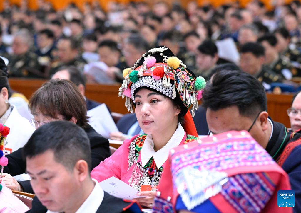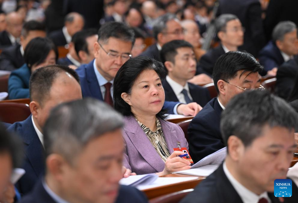 Lu Lihua (C), a deputy to the 14th National People's Congress (NPC), attends the opening meeting of the third session of the 14th NPC at the Great Hall of the People in Beijing, capital of China, March 5, 2025.