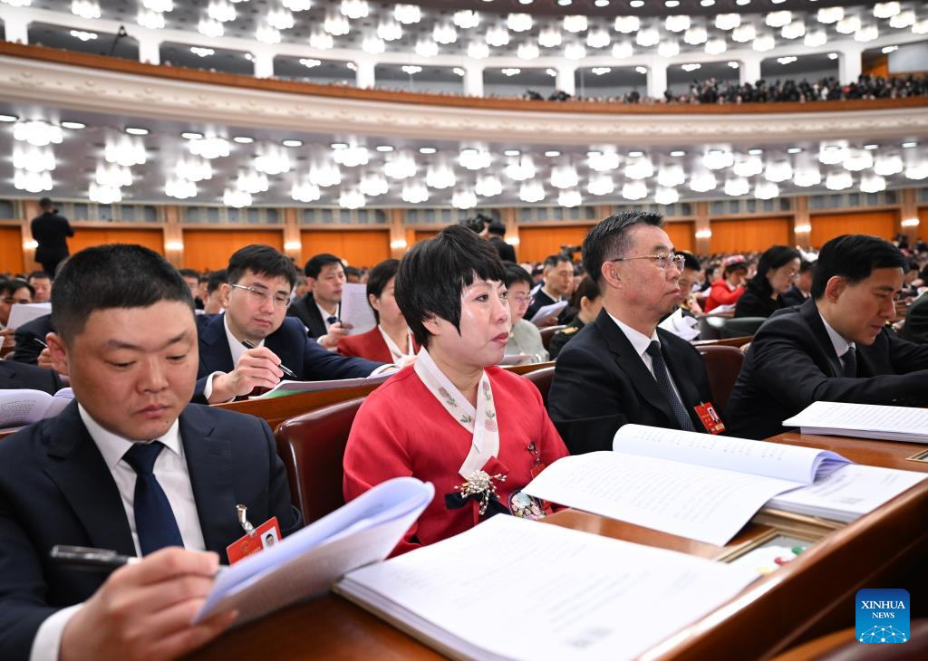 Deputies to the 14th National People's Congress (NPC) attend the opening meeting of the third session of the 14th NPC at the Great Hall of the People in Beijing, capital of China, March 5, 2025.