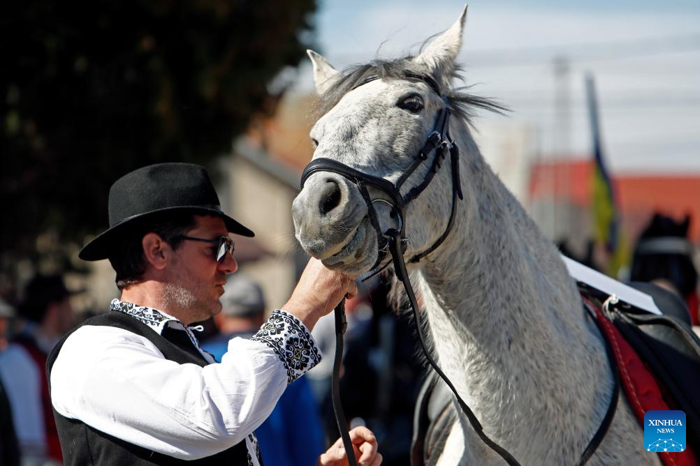 A man prepares his horse for a caballine beauty contest during the celebration of the traditional "Tudorita" holiday, also known as the Easter of Horses, in Targoviste, Romania, March 8, 2025. Easter of Horses is celebrated by the local Bulgarian community and symbolizes the start of agricultural work in the new year. (Photo by Cristian Cristel/Xinhua)