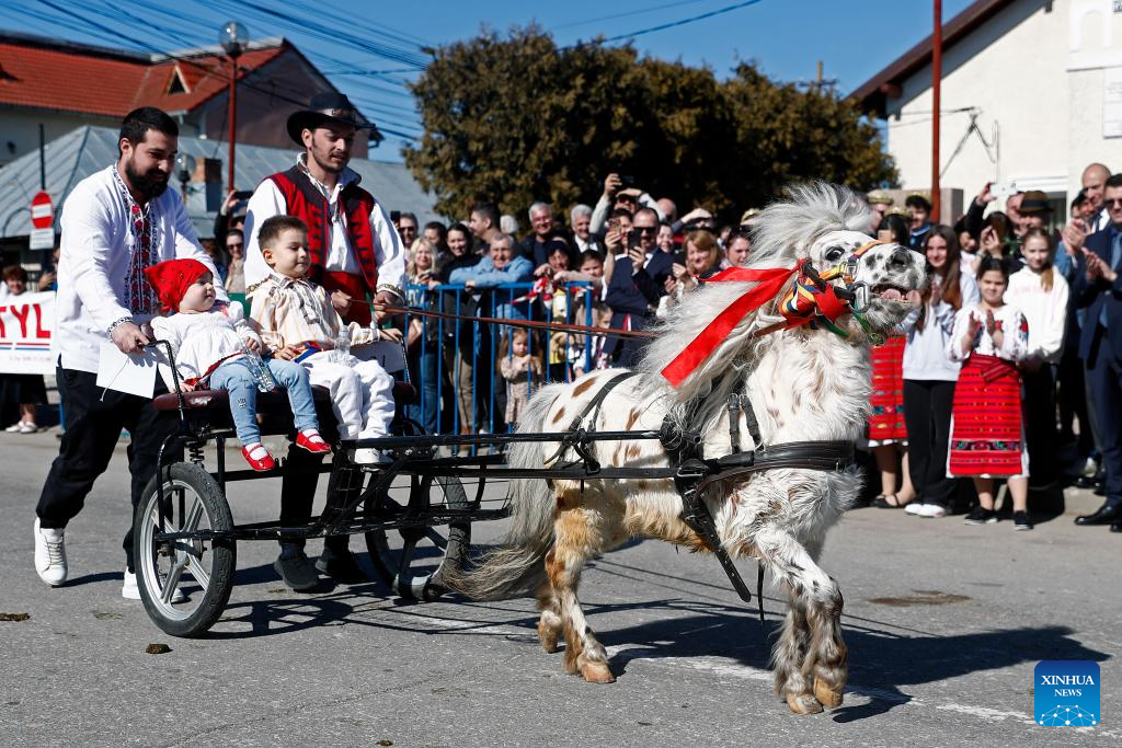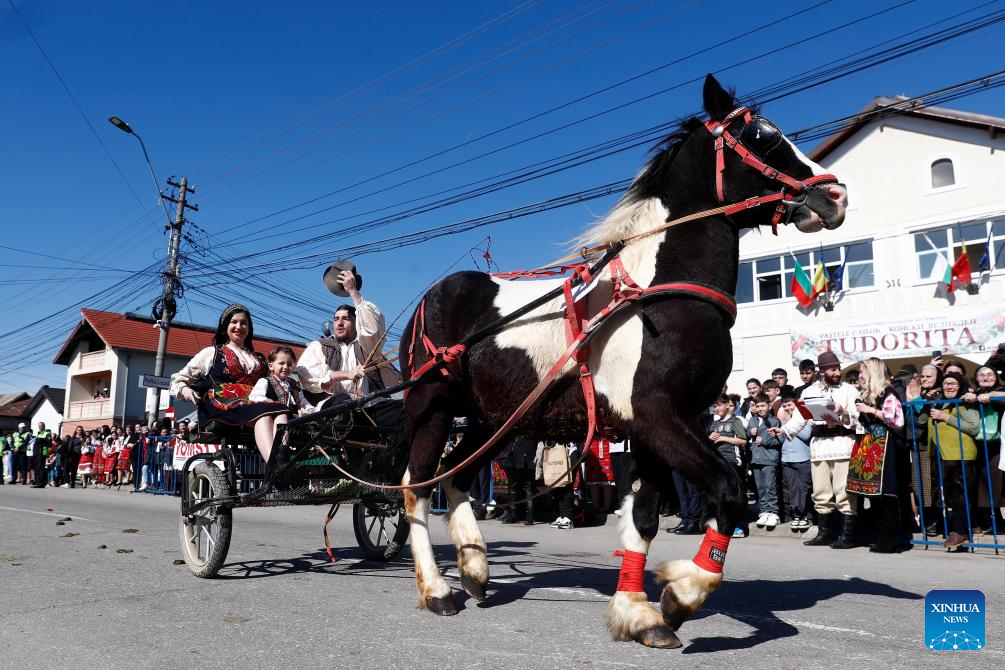 People ride their horse-driven cart for a caballine beauty contest during the celebration of the traditional "Tudorita" holiday, also known as the Easter of Horses, in Targoviste, Romania, March 8, 2025. Easter of Horses is celebrated by the local Bulgarian community and symbolizes the start of agricultural work in the new year. (Photo by Cristian Cristel/Xinhua)