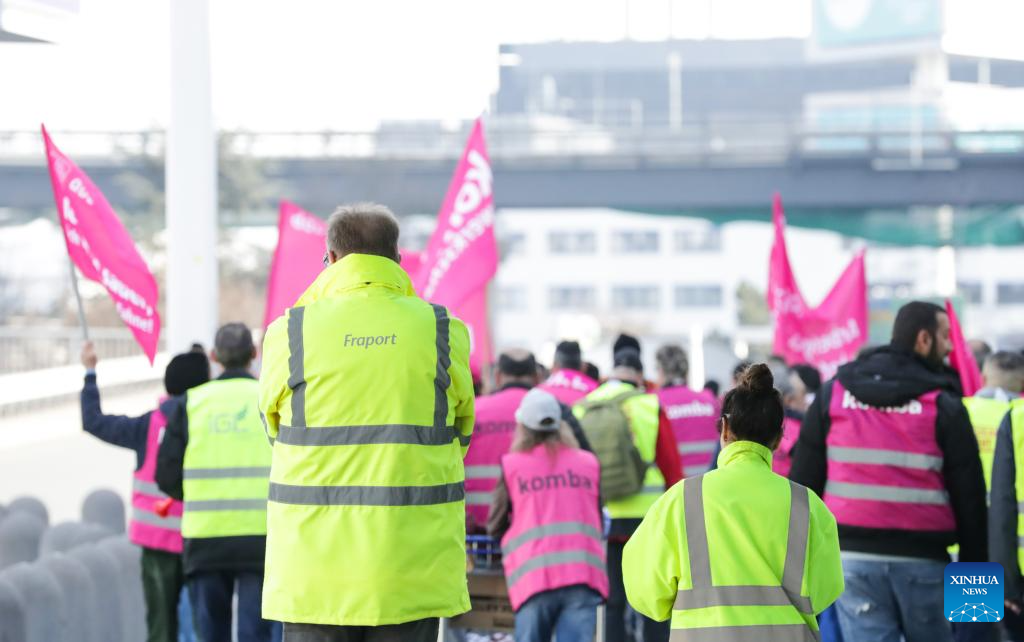 People demonstrate at the Frankfurt Airport in Frankfurt, Germany, March 10, 2025. Over 1,000 flights at the Frankfurt Airport have been affected as airport workers went on strike on Monday. (Xinhua/Zhang Fan)