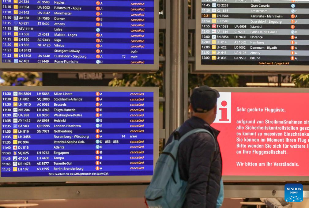 Passengers look at a display screen showing flight information at the departure hall of the Frankfurt Airport in Frankfurt, Germany, March 10, 2025. Over 1,000 flights at the Frankfurt Airport have been affected as airport workers went on strike on Monday. (Xinhua/Zhang Fan)