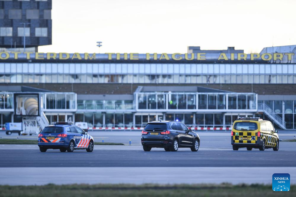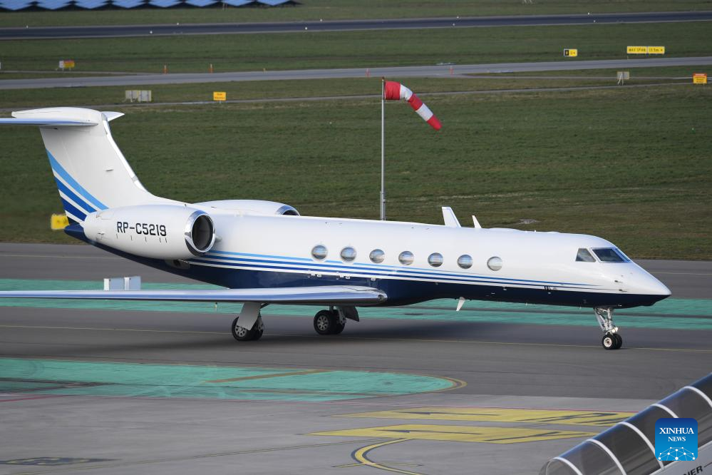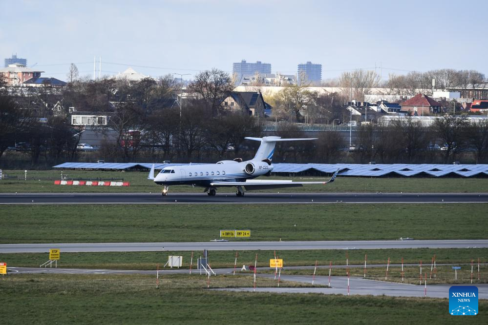 A plane carrying former Philippine President Rodrigo Duterte lands at Rotterdam The Hague Airport in Rotterdam, the Netherlands, on March 12, 2025. A plane carrying former Philippine President Rodrigo Duterte arrived on Wednesday afternoon at Rotterdam The Hague Airport in the Netherlands. (Xinhua/Peng Ziyang)