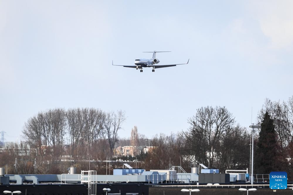 A plane carrying former Philippine President Rodrigo Duterte prepares to land at Rotterdam The Hague Airport in Rotterdam, the Netherlands, on March 12, 2025. A plane carrying former Philippine President Rodrigo Duterte arrived on Wednesday afternoon at Rotterdam The Hague Airport in the Netherlands. (Xinhua/Peng Ziyang)