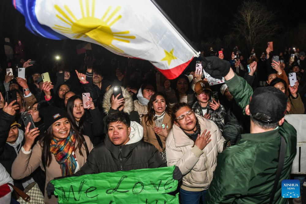 Supporters of former Philippine President Rodrigo Duterte wait outside the detention center of the International Criminal Court (ICC) in The Hague, the Netherlands, March 12, 2025. A plane carrying former Philippine President Rodrigo Duterte arrived on Wednesday afternoon at Rotterdam The Hague Airport in the Netherlands. (Xinhua/Peng Ziyang)