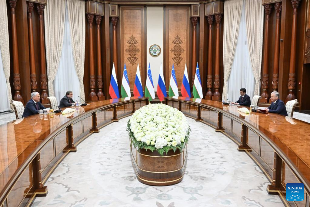 Uzbek President Shavkat Mirziyoyev (R) meets with Chairman of the Russian State Duma Vyacheslav Volodin in Tashkent, Uzbekistan, March 14, 2025. Mirziyoyev and Volodin addressed the current issues affecting the comprehensive strategic partnership between Uzbekistan and Russia during their meeting, according to a statement from the Uzbek president's press service. (Press Service of the Uzbek President/Handout via Xinhua)