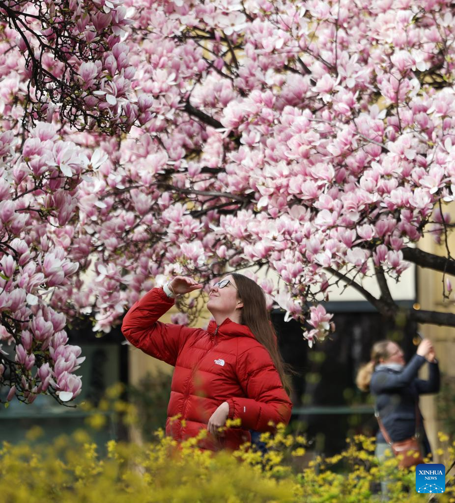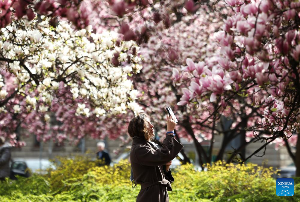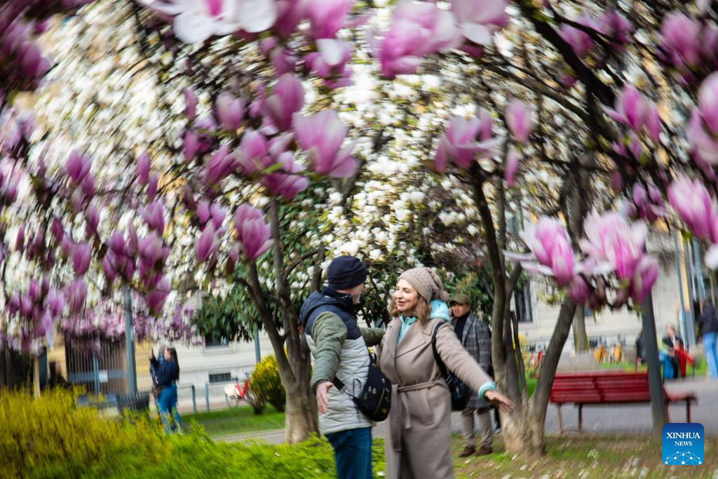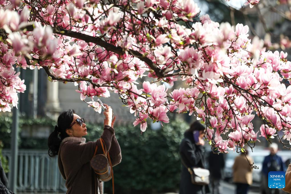 People enjoy magnolia flowers in Milan, Italy, March 18, 2025. (Xinhua/Li Jing)