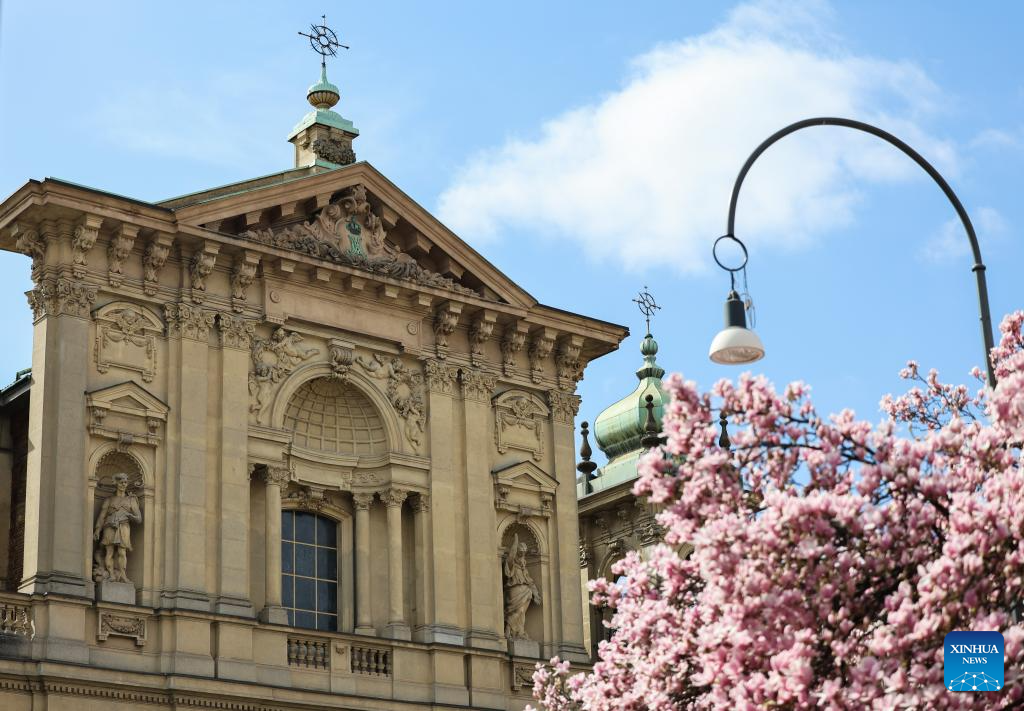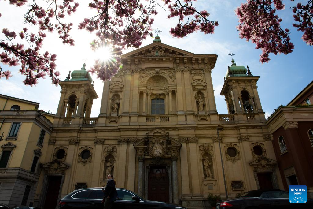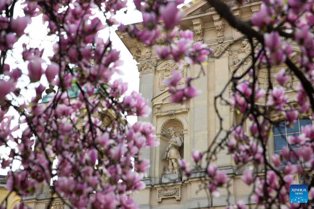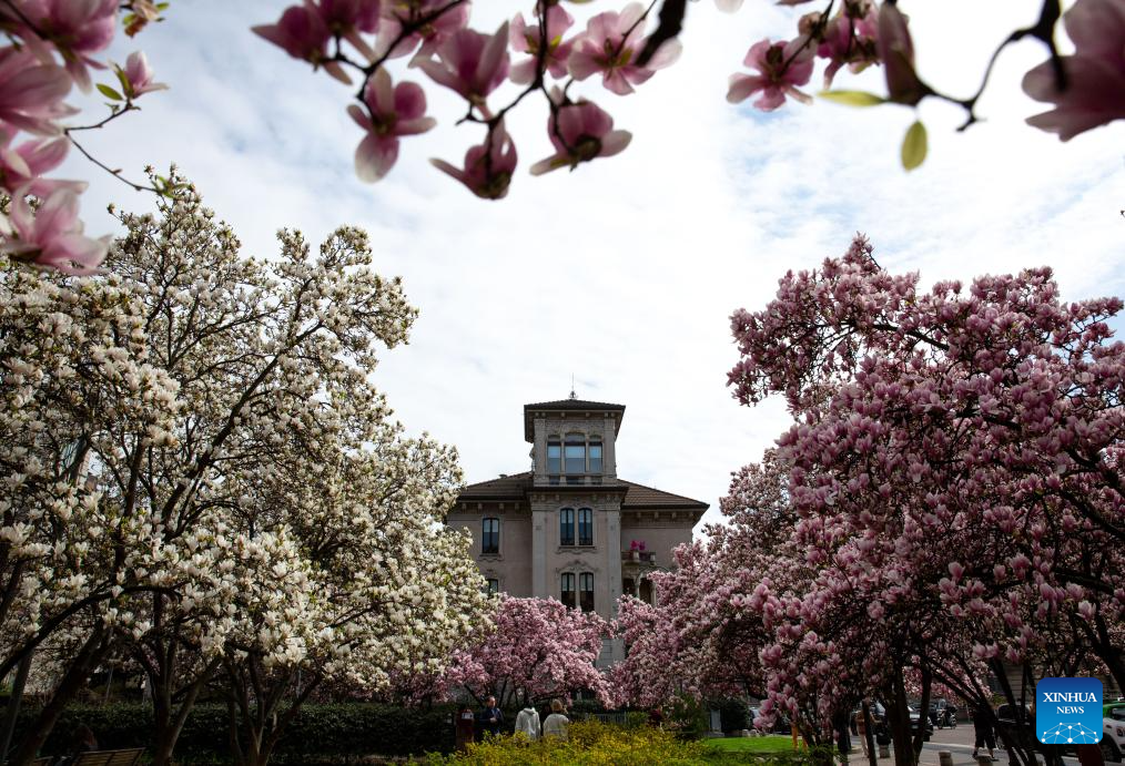 Blooming magnolia flowers are seen in Milan, Italy, March 18, 2025. (Xinhua/Li Jing)